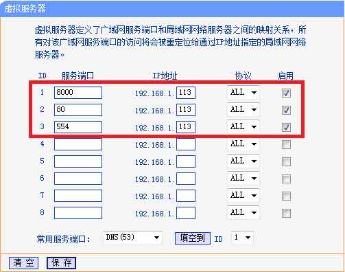 登陸路由器的配置界面,找到虛擬服務(wù)器(或者是端口映射),映射端口(設(shè)備默認(rèn)80、8000、554三個(gè)端口,可在設(shè)備上修改,三個(gè)端口必須同時(shí)映射,缺一不可)