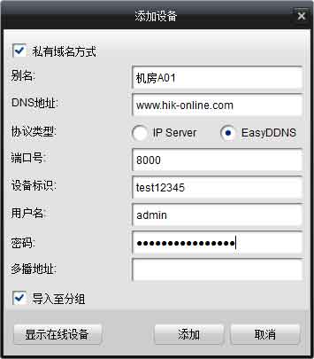 打開(kāi)iVMS-4200客戶端軟件,進(jìn)入“設(shè)備管理”界面添加設(shè)備。選擇私有域名方式添加,協(xié)議類(lèi)型選擇成??礑DNS,填寫(xiě)設(shè)備域名、用戶名、密碼,即可正常使用iVMS-4200客戶端軟件訪問(wèn)設(shè)備。
